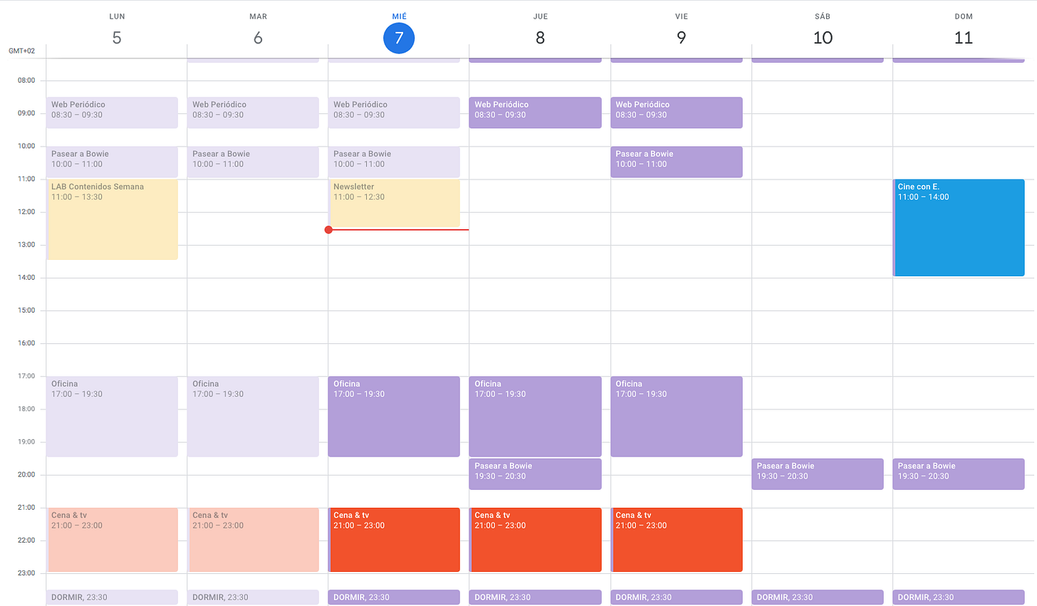 Yo he colocado en morado aquellas cosas que son inamovibles: dormir, el trabajo, pasear al perro… En amarillo, el tiempo para “mis proyectos”; en rojo, los ratitos para mi; y en azul, para amigos, familia, etc. Por supuesto, mis semanas nos son siempre iguales, ni siquiera un día es igual a otro, y no tengo unas horas fijas para dedicar a muchas de mis tareas o proyectos porque tengo que tener en cuenta el calendario familiar, etc. Sabemos también que muchas veces la vida es la que nos lleva, hay imprevistos…
